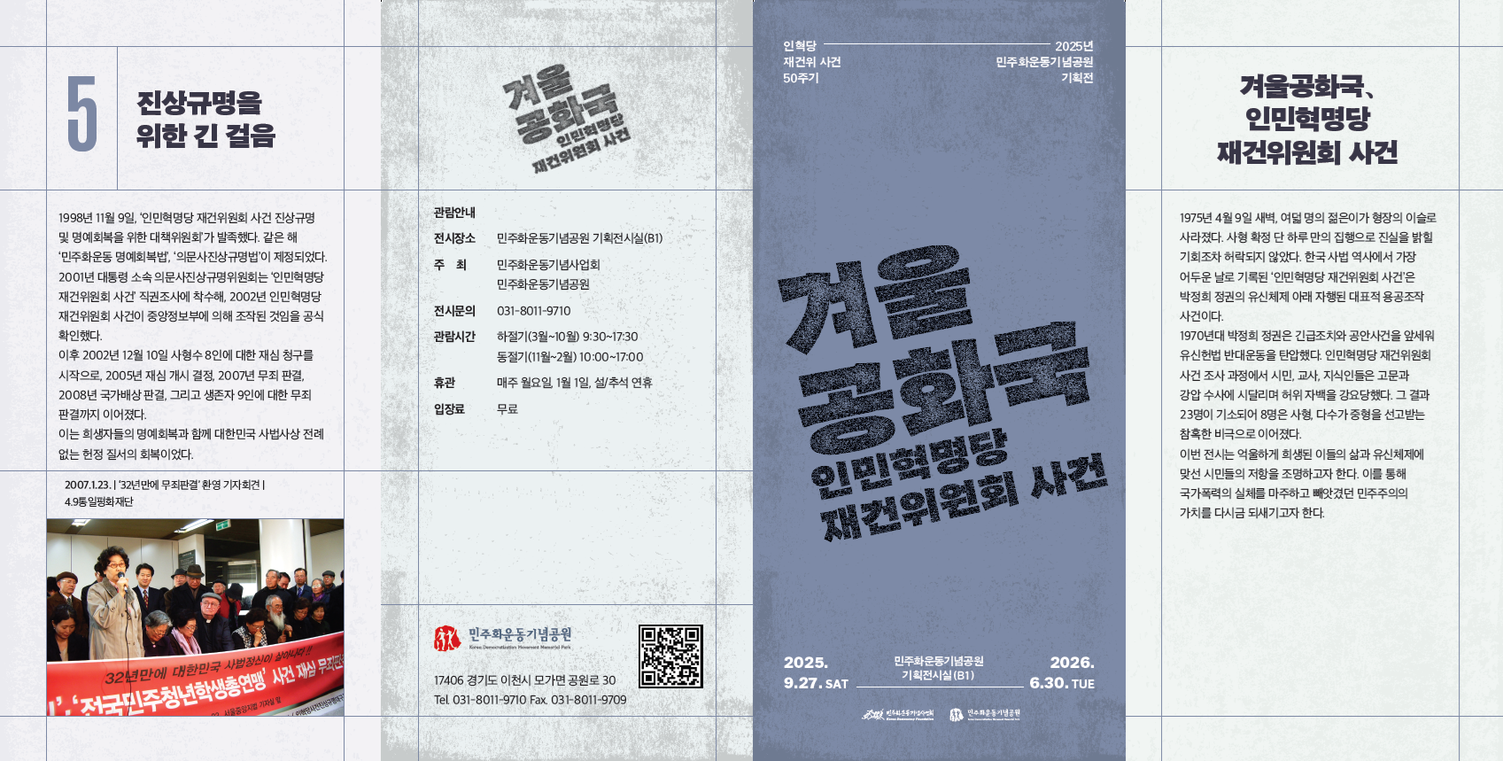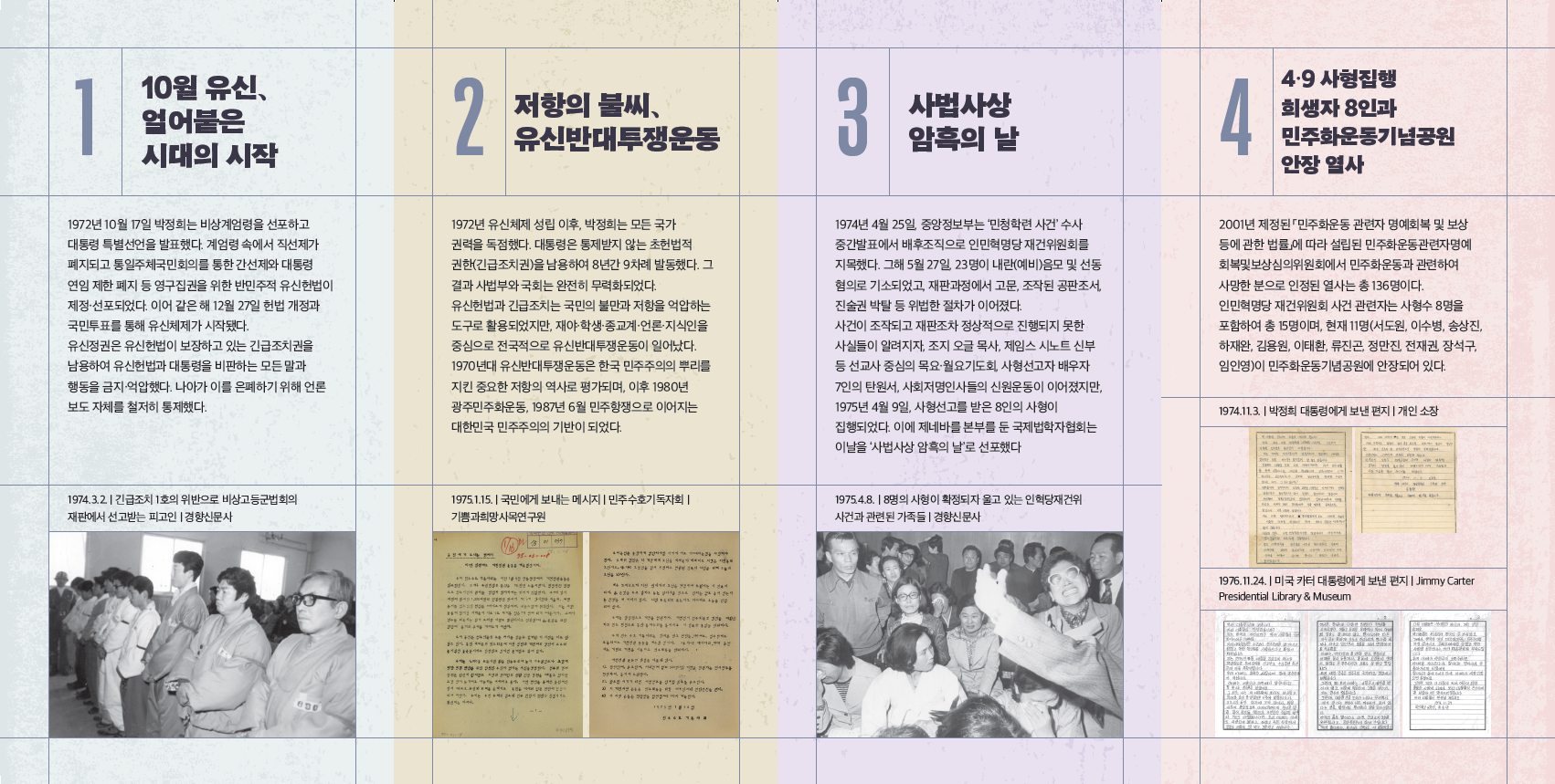 이번 전시는 1970년대 겨울공화국, 유신체제에 대한 유신반대투쟁을 비롯하여, 박정희 정권의 대표적 용공조작 사건인 인민혁명당 재건위원회 사건의 전개와 저항, 그리고 2000년대 무죄 판결을 통한 명예회복 과정을 조명하며 민주주의와 법치주의의 소중함을 다시금 일깨우고자 합니다.